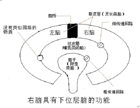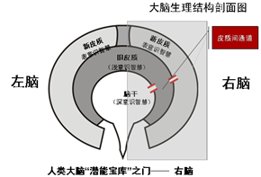 上帝给我们留下了一道门——皮质间通道,新皮质层和旧皮质层间有一个较窄的通道,旧皮质和脑干之间有一个较宽的通道,这两个通道存在于大脑的右半球,因此科学家认为,要想打开智慧之门,必须努力的去训练我们的右脑,右脑是人类大脑“潜能宝库”之门。